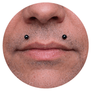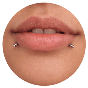 Dos perforaciones bajo el labio inferior, una a cada lado (simétricas). Se suelen llevar con barras con disco interno y quedan muy reconocibles sin recargar.