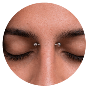 Perforación horizontal en la parte superior de la nariz, entre los ojos. Muy visible y no apto para todos los tipos de anatomía.