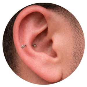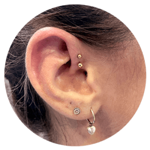 Perforación en el pliegue de cartílago que queda por encima del daith, hacia la parte superior interna de la oreja. Suele lucir bien con barras curvas pequeñas.