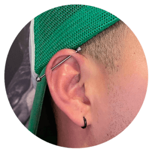 Va en el borde interior medio de la oreja, paralelo al hélix. Es un piercing más técnico y llamativo, con barras cortas y bien medidas.