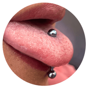 Perforación vertical en el centro de la lengua. Suele llevar barra con discos/bolas. Requiere cuidados específicos por el movimiento constante y el contacto con comida/bebida.