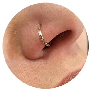 Perforación en el tejido blando entre las fosas nasales, no en el cartílago macizo. Admite aros, horseshoes y piezas decoradas. Se puede llevar visible o esconder según la joya.