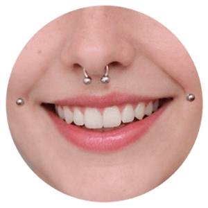 Piercing centrado en el filtro, el surco entre el labio superior y la nariz. Muy protagonista con una pieza pequeña pero visible.